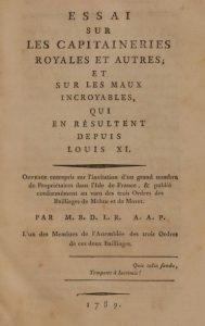 [BOUCHER DE LA RICHARDERIE (Gilles)]. Essai sur les capitaineries royales et autres, et sur les maux incroyables qui en résultent depuis Louis XI… 1789. In-12, 12 x 19 cm, VIII + 186 pp., 1 f., demi-chagrin bordeaux à la Bradel, dos orné de fers révolutionnaires dorés, non rogné (reliure moderne). Unique édition de ce rare essai d’un avocat au parlement de Paris.