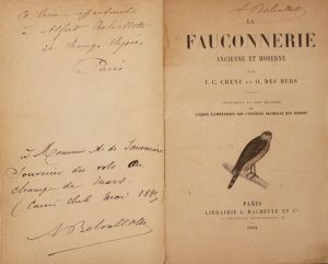 Exemplaire du grand fauconnier Alfred Belvalette, avec signature sur le titre, mention manuscrite au verso du feuillet blanc et ex-dono manuscrit à A. de Sauvenière en « souvenir des vols au Champ de Mars » en mars 1885. Vignette représentant un chaperon collée au recto du feuillet blanc. Feuillets uniformément brunis, un détaché. Dos usé.