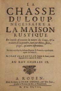 CLAMORGAN (Jean de). La chasse du loup… Rouen, vve Jean Berthelin, 1698. In-4, 16 x 22,5 cm, 16 …