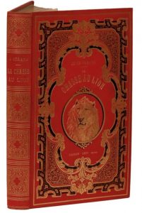 GÉRARD (Jules). La chasse au lion. Paris, Michel Lévy frères, 1874. In-4, 16,5 x 26 cm, 4 ff., 374 pp., 1 f., percaline rouge, plaque historiée dorée et à froid sur le premier plat, dos lisse orné, tranches dorées (cartonnage de l’éditeur). Les souvenirs et anecdotes de Jules Gérard, lieutenant de spahis, le plus célèbre chasseur d'Algérie, qui fut fasciné par le lion de l'Atlas, avec des récits de chasse à la panthère, à la hyène, au sanglier, au chacal, à l'antilope, au lièvre, etc.