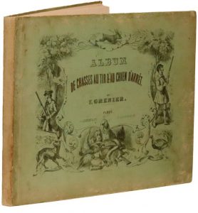 GRENIER (Francis). Album des chasses au tir & au chien d’arrêt. Paris, Aubert, vers 1840. In-4 oblong, 33 x 24,4 cm, 1 f., 33 pl., 1 f., papier vert illustré (cartonnage de l’éditeur). « Le plus bel album de Grenier » (Thiébaud) composé d’un titre-frontispice et de 33 planches lithographiées.