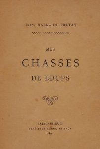 HALNA DU FRETAY (baron). Mes chasses de loups. Saint-Brieuc, impr. René Prud’homme, 1891. In-8, 14,5 x 22 cm, 140 pp., 1 f., frontispice et 1 pl., broché. Édition originale, tirée à 150 exemplaires hors-commerce. Illustré d’un frontispice en héliogravure et d’un tirage à part de la vignette de couverture.