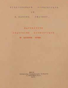 [LANGEARD (Paul)]. Bibliothèque cynégétique de M. Marcel Jeanson. Manuscrits, chartrier cynégétiqve et documents divers. [Tapuscrit]. Paris, Thiébaud, 1937. [35] ff., en feuilles, chemise. Transcriptions de 25 documents originaux appartenant à M. Jeanson, en vue d’une publication qui ne vit jamais le jour : pièces juridiques, quittances, permis, commission de louvetier, etc., du XIIIe siècle à la Restauration.