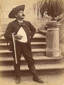 Belle et grande photographie originale de l’auteur avec son fusil devant un perron, montée sur papier fort et reliée en tête. Couvertures du premier volume doublées avec manques.