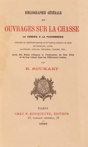 SOUHART (Roger). Bibliographie générale des ouvrages sur la chasse, la vénerie & la fauconnerie. Paris, Rouquette, 15 avril 1886. In-4, 16 x 24,5 cm, VIII pp., 2 ff., 376 pp. (750 colonnes), 3 ff., demi-percaline verte à la Bradel, non rogné, couverture. (cartonnage moderne). Édition originale d’une des plus importantes bibliographies cynégétiques, précurseur du “Thiébaud”, qui reste intéressante à consulter car Souhart décrit des milliers d’ouvrages en français mais aussi en langues étrangères (latin, allemand, anglais, espagnol, italien…)