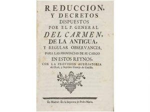 1772 ca. (CARMELITAS). XIMENEZ, Fr. JOSE ALBERTO: REDUCCIÓN Y DECRETOS DISPUESTOS POR EL P. GENERAL DEL CARMEN, DE LA ANTIGUA Y REGULAR OBSERVANCIA, PARA LAS PROVINCIAS DE SU CARGO EN ESTOS REYNOS, CON LA PROVISIÓN AUXILIATORIA DEL REAL, Y SUPREMO...