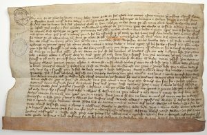 DEUX-SÈVRES. 1402. CHERVEUX. Devant Johan REMER Garde du Scel établis aux Contrats de SAINT MAIXENT pour très haut et puissant Duc de BERRY. Échange et permutation de terres à CHERVEUX entre Philippon MICHEA et Marot OLLIVIER. Ces lieux relevant des Seigneurs de CHERVEUX. Fait le 8 Avril 1402. Parchemin (23 x 33 cm). Cachet de l'Ordre de Malte.