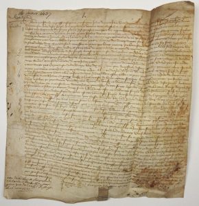 (MAINE-ET-LOIRE. MONTJEAN-SUR-LOIRE) 1437. BARONNIE DE MONTJEAN (ou MONTEJEHAN) Aveu de la terre des Forges rendu à la Baronnie de MONTJEAN par Pierre GUESDON, Seigneur des Forges. (Route de La Pommeraye 49). Parchemin (31 x 30) (René de MONTJEAN fut Maréchal de France en 1538)