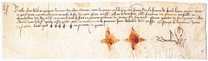 NORMANDIE . CHARTE DE 1454. CAEN (14). Mandat de paiement des gages dus à Jean Picquet Receveur des Aides ordonnées pour la Guerre en l'élection de CAEN. Ecrit le 2 Juillet 1454. Mention de Jean Le Boursier, Chevalier, Seigneur de STERNAY, Chambellan du Roi, Général sur le fait de ses finances. Parchemin (7 x 26 cm).