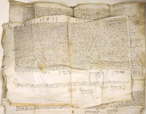 (CÔTE D'ARMOR. 1570.) TRÉDARZEC. PLOCBIHAN : 2 Parchemins liés (41 x 58) et (64 x 63). Contrat de vente, de 1570, consenti par Olivier MERAULT de TRÉDARZEC à Guillaume CARION de TRÉGUIER, d'héritage audit Tréguier. (Terres à Plocbihan.)