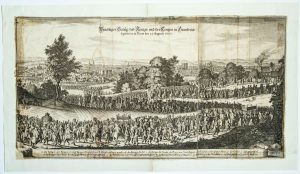 CORTÈGE DU ROI LOUIS XIV ET DE LA REINE entrant à PARIS le 26 août 1660. Gravure XVIIe s. Par Mérian. Texte en allemand. Montage à fenêtre. (28 x 53 cm). Etat B-. Qqs manques.