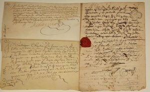 AISNE. Famille Noble DE LAMER. 4 Pièces signées : Pièce signée Claude DE LAMER Procureur du Roy alternatif en l'élection de LAON. Quittance de ses gages, 1664. Billet en parchemin (12 x 13) + 2 Pièces signées Charles DE LAMER Conseiller du Roy élu en l'Élection de LAON. Fait à Laon 24 Août 1667 et en 1664. Quittances de ses gages, 2 Parchemins (14 x 21) + Extrait de Baptême de la Paroisse de SAINT PIERRE-LES-FRANQUEVILLE avec Souscription signée, pour certification en 1760, par François DE LAMER de MONCEAUX Conseiller du Roy, Président au Bailliage Siège Royal et Comté de MARLE, et Juge en la juridiction des Eaux et forêts dudit Comté. Sceau de cire du Bailliage de MARLE. Papier 2pp in-4°.