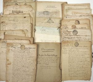 MAYENNE. ILLE-ET-VILAINE. RABINAUD DES MALICOTTES. Environ 70 Parchemins et papiers de 1666 à 1764. Ensemble de pièces concernant le Seigneur Jean Claude RABINAUD DES MALICOTTES demeurant à MAYENNE et à leur Manoir à ST SAUVEUR DES LANDES (35), sa fratrie RABINAUD DES MAUCOTTES Ecuyer, RABINAUD DE SURAVENNES, et ses Familles par alliances PRODHOMME Sieur de la BROSSE. Contrat de Mariage 1729 de Messire Jean Claude RABINAUD Sieur de MALICOTTES Ecuyer, Conseiller du Roi et ancien Président en l'Election de la Ville de Mayenne. Partage entre MM. RABINAUD de SUVARENNES et RABINAUD de MALICOTTES de la succession de leur père, 1747. Testament de Mr de SURAVENNE 1764. Sentence de la Châtellenie de LIGNIÈRES (Mayenne) 1768. Extrait du siège civil et criminel de la Baronnie FONTAINE-DANIEL (53) séante à MAYENNE 1784. Aveu par Madame De SURAVENNE à la Seigneurie de CHAUDEBOEUF (35) 1773. Baux. État comptable 1772. Licitation...