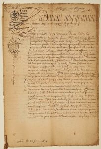 EURE-ET-LOIR. 1674. Pardevant George AMIOT Notaire Royal à CHAMPROND-EN-GÂTINE, Testament et codicille de Dame Elisabeth BAUGER femme d'Honorable homme M. Gérard CHOUET Conseiller et Secrétaire de feu la Reyne mère, Bailli et Maître particulier des Eaux et forêts de la Baronnie de CHAMPROND, demeurant à Champrond, du 11 Février 1674. (cachet du Cabinet d'Hozier) 3pp in-folio.