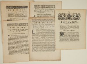 LES VINS. PARIS. 7 Édits du ROI imprimés in-4° : 1) «Édit du Roy portant suppression des Courtiers et Commissionnaires des Vins, Cidres, Eau-de-vie & Liqueurs & Création en titre d'Office de Courtiers et Commissionnaires dans toutes les Villes & Bourgs du Royaume.» Paris 1691 - 2) «Arrest du Conseil d'État du Roy, qui ordonne que dans huitaine... les 60 anciens Jurés Vendeurs & contrôleurs de Vin de la Ville de Paris, seront tenus de faire leur soumission au bureau de M. Gonnet chargé par sa Majesté du recouvrement de la finance qui proviendra de la vente des 40 nouveaux Offices...» 1703 - 3) «Édit du Roy, portant Création de 20 Offices de Jurés-Vendeurs & Contrôleurs de Vins, Cidres & autres Boissons & liqueurs, par Augmentation dans la ville de Paris. 1703 - 4) «Déclaration du Roy pour l'Union des Offices de Syndics à la Communauté des Jurés Vendeurs & Contrôleurs de Vin & autres Boissons de la Ville & Faubourgs de Paris.» 1705 - 5) «Édit du Roy portant Création de 50 Offices de Facteurs-Commissionnaires de Vins & autres liqueurs entrants dans la Ville & Faubourg de Paris, pour avec les 100 pareils Offices cy-devant crées faire une Communauté de 150.» 1705 - 6) «Édit du Roy portant rétablissement des 120 Anciens déchargeurs, rouleurs & chargeurs de Vins à Paris.» 1705 -7) «Édit du Roi, donné à Versailles au mois d'avril 1776. Par lequel Sa Majesté permet de faire circuler librement les Vins dans toute l'étendue du royaume, de les emmagasiner, de les vendre en tous lieux & en tout temps, & de les exporter en toute saison, par tous les ports, nonobstant tous privilèges particuliers & locaux à ce contraires, que Sa Majesté supprime.» - Impr. de la Veuve André Giroud, Imprimeur-Libraire du parlement, à la Salle du Palais. 1776 ; 11pp in-4°.
