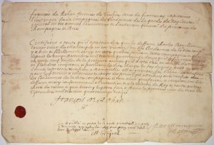 François de ROHAN, Prince de SOUBISE (1630-1712) Duc de Frontenay, Capitaine Lieutenant de la Compagnie des GENDARMES de la Garde du Roy, lieutenant général en ses armées, Gouverneur et Lieutenant Général des Provinces de CHAMPAGNE et de BRIE - Pièce signée à son en-tête manuscrite. Il certifie que le défunt Charles BOUILLANT, Ecuyer sieur de Montaigus, en son vivant l'un des Gendarmes de ladite Compagnie, y a bien et fidèlement servi pendant cette Campagne et que le 29 juillet 1693, il a été tué au combat de NERVINDE en Flandres. Nous avons donné le présent certificat à damoiselle Marguerite DE BAZON, sa veuve...» - Fait à Paris le 1er Septembre 1693 - 1 page (24 x 36) - Sceau de cire aux armes.