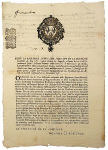 GUIENNE. 1699 - “Félix LE PELLETIER Chevalier Seigneur de LA HOUSSAYE Intendant en la Généralité de MONTAUBAN, & Charles DUMONT Baron de Blaignac Grand Maître des EAUX & FORÊTS de France au Département de la GUIENNE... pour l'exécution du jugement du 21 Sept 1696 - “Ordonnons que les Bois & Forêts... seront à l'avenir clos & fermés..., sauf les bois nécessaires pour l'entretien des Forges & réparations des Bâtiments situés sur le Territoire réuni aux Domaines du Roy & à l'ABBAYE DE COMBELONGUE (09) par ledit jugement; Défenses aux habitants ... d'y faire aucune coupe & d'acheter aucun bois ou charbon provenant desdits Forêts...” - Fait à MONTAUBAN (82) 27 mars 1699 - Vignette royale. Placard (33 x 24) État A