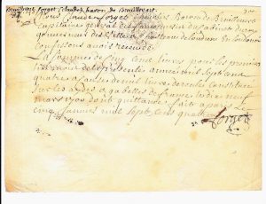 FAUCONNERIE - LOUDUN (VIENNE) - Pièce signée Claude FORGET Chevalier Baron de BREUILLEVERT Capitaine général des Fauconneries du Cabinet du Roy, Gouverneur des Ville et Château de LOUDUN en Loudonnois - Quittance à cause de Mille livres de rente constituée sur les Aydes et Gabelles de France le 10 mars 1700 - Paris 1704 - Parchemin 1p in-8° - Cachet.