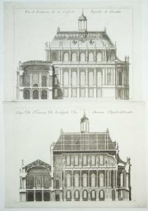 YVELINES. LA CHAPELLE ROYALE du Château de VERSAILLES achevé en 1710 - 4 Planches d'Architecture début XVIIIe, représentant la cette Chapelle Royale de Versailles en coupes. «Coupe de l'intérieur de la Chapelle du Château Royale de Versailles» (34 x 45). «Coupe de l'Hôtel de la chapelle de Versailles» (46 x 29), «Vue de l'extérieur...» (32 x 44), «Coupe de la Chapelle de Versailles du côté de la Tribune du Roy.» (46 x 32)