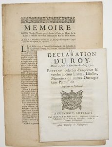 LIBRAIRIE & IMPRIMERIE. 2 Imprimés : “Déclaration du ROY, donnée à Paris le 12 May 1717, portant défenses d'imprimer & vendre aucuns Livres, Libelles, Mémoires ou autres ouvrages sans permission.” - Vignette du DAUPHINÉ - Impr. à GRENOBLE, au Palais chez Gaspard GIROUD, 10pp in-4° - Vignette & Lettrine - «Les Rois nos prédécesseurs ont regardé de tous les temps, comme un des objets les plus importants de la Police, l'impression de la vente des Livres, par le moyen desquels on ne peut que trop aisément corrompre les mœurs des Peuples, diffamer les personnes les plus respectables, répandre des maximes contraire aux droits de l'Etat & aux intérêts de la Religion...» + “MÉMOIRE pour Charles OSMONT Père, Libraire à PARIS, & Alexis de la ROUÊ Marchand Miroitier ordinaire du Roy et de la Reine, au sujet de la Procédure extraordinaire qui se fait par Commission du conseil contre Charles OSMONT Fils Imprimeur rue St Jacques.” - “on a trouvé chez Osmont plusieurs Libelles contre la Religion, l'État, les bonnes mœurs, & la tranquillité publique...” (vers 1727) - Imprimé chez GONICHON, Pont Saint-Michel, au Sacrifice d'Abraham : 4pp gd in-folio.