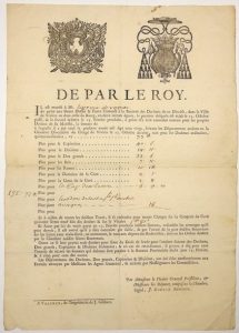 ARDÈCHE. 1720. VAGNAS (07) - De par le Roy, il est mandé à Mr le Prieur de VAGNAS (07) de payer, aux Sieurs DOIZE et FAURE Commis à la recette des Décimes de ce Diocèse, dans la Ville de VIVIERS (07) ou dans celle du Bourg, les susdites taxes pour l'année 1720. (Capitation, Dixième, Don gratuit, Bois, Rentes, Domaine de la Cure,...) à peine d'y être contraint. Affiche impr. à VALENCE, chez J. Gilibert. (37 x 26 cm) remplie à l'encre, 2 Vignettes (Royale et au Blason de l'Evêque de VIVIERS)