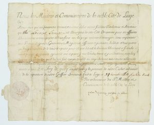BELGIQUE. LIÈGE. Ensemble de 10 Documents anciens concernant la Belgique de 1730 à 1819 : Passeport du 11 Déc. 1730. Acte sur parchemin du Conseil Souverain du Brabant à Nivelles 1757. Document imprimé du Département de l'Ourte de l'An 6 (1798) concernant les visites domiciliaires, «pour arrêter les agents de l'Angleterre, les émigrés rentrés, les prêtres déportés rentrés, les égorgeurs, les brigands, les chefs des Chouans qui n'ont pas déposés les armes...» Documents concernant les Hospices civils de Liège (1818/1819). Passeport manuscrit, Liège 1819.