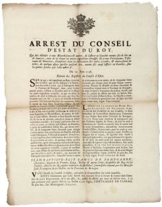 TOILES À VOILE QUI SE FABRIQUENT EN BRETAGNE. 1738 - “Arrest du Conseil d'État du Roy, qui fait défenses à tous Blanchisseurs & autres, de lessiver ni blanchir aucuns fils de lin ou de chanvre, avec de la chaux ni autres ingrédients corrosifs; et à tous les fabricants, Tisserands & Ouvriers, d'employer dans la Fabrication des toiles à Voiles, de quelque espèce qu'elles puissent être, aucuns fils ainsi lessivés ou blanchis, sous les peine portées par ledit Arrêt. - du 15 Juin 1738 - suivi de l'Ordonnance de Jean Baptiste Élie CAMUS DE PONTCARRÉ, Chevalier, Seigneur de VIARME.. , Conseiller du Roy, Commissaire départi par Sa Majesté pour l'exécution de ses ordres en la Province de BRETAGNE - Fait ce 19 Juillet 1738. Vignette. Placard (44 x 34) État A