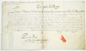 CHÂTEAU DE VERSAILLES (78). 1747. Retenue d'aide de Paneterie et Échansonnerie Bouche du Roi pour Monsieur Etienne Touchard auprès de la Dauphine. Manuscrit sur vélin daté du 14 janvier 1747. Signé du Roy Louis XV (Secrétaire), contresigné Jean Frédéric PHÉLYPEAUX, comte de Maurepas Entête «De par le Roy, Premier Maitre d'Hôtel de notre très chère et très Amée Fille La Dauphine, Maitres ordinaires de Son Hôtel, Contrôleurs et Trésoriers Généraux de Sa Maison...» Réparation d'une déchirure au milieu. (28,5 x 48 cm)