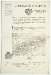 LOIRET. 1752. BATAILLON DE MONTARGIS (45). MILICE. Pièce signée BARENTIN Seigneur d'Hardivilliers, Intendant dans la Généralité d'ORLÉANS. Congé absolu au nommé Jacques Madeleneau dit Bellecoeur, Milicien de la Paroisse de Saint Sauveur de la levée de 1750, lequel sert en qualité de soldat. Fait à Orléans (45) le 25 May 1752. 2 Vignettes Royale et aux armes.