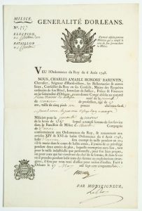 BATAILLON DE CHARTRES (28). MILICE. 1753. Pièce signée BARENTIN Seigneur d'Hardivilliers, Intendant dans la Généralité d'ORLÉANS. Congé absolu au nommé René Vincent dit Bellefin, Milicien de la levée de 1747, lequel a rempli son service dans le Bataillon de Milice de CHARTRES. Fait à ORLÉANS (45) le 17 May 1753. 2 Vignettes Royale et aux armes.