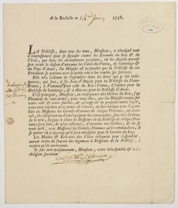 Jean Charles de La Ferté, Marquis de SENNETERRE ou Saint-Nectaire, Maréchal de France en 1757 Lettre impr. avec Signature Autogr. “le Maal de SENECTERE”, à la ROCHELLE (17) ce 14 juin 1758 - à M. De VILLIERS à Villiers - Petit cachet de collection - Il lui demande en tant que Noble de se rendre avec armes et cheval pour se signaler contre les ennemis du Roy & de l'État. «Dans les circonstances présentes, où les Anglais paraissent avoir le dessein d'attaquer les Côtes du Poitou, de Saintonge & du Pays d'Aunis...»