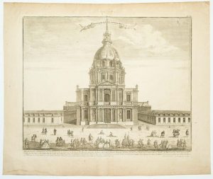 «ÉGLISE ROYALE DES INVALIDES.» Gravure de 1761 : «l'Hôtel des Invalides construit en 1675 par ordre du Roy Louis Le Grand, sur les dessins de Mr Mansart son premier Architecte...» A Paris, chez Chereau, rue St Jacques au Coq, 1761. (42,5 x 50,5 cm) Etat B.