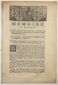 AISNE. 1762. LAONNOIS - DE MASSÜE Marquis de RUVIGNY (10), Baron de RENNEVAL (02). Procès à l'égard du prix de la Terre de RENNEVAL (Aisne). «Mémoire (de procès) sur délibéré, pour le Dame Veuve du Sieur DAULT DU MESNIL & Autres, Intervenants & Demandeur, tous héritiers en partie du Marquis de RUVIGNY. Contre les Sieurs COCQUINOT & SAMSON, receveurs des Consignations, Défenseurs. En présence de Monsieur FERRAND, Conseiller en la Cour & autres, aussi Héritiers du Marquis de RUVIGNY.» De l'Imprimerie de Ch. Est. CHENAULT, rue de la Vieille Draperie, 1762. Bandeau & lettrine, 24pp in-folio. «... Il s'agit, dans la Cause, de savoir, si le prix de la Terre de Renneval, qui était déposé aux Consignations (étant entré dans le contrat sur les Aydes et Gabelles...) Il a été en leur pouvoir d'épuiser ce contrat aux préjudices des héritiers de Ruvigny, à qui le prix de la terre de Renneval appartient...»