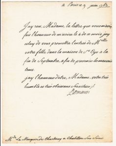 Marie François de Paule LE FEVRE D'ORMESSON (1710-1775) Chevalier, 1er Marquis d'ORMESSON, Baron de la Queue, Seigneur d'Omme, le Crest, & autres lieux; Conseiller d'État ordinaire, & au Conseil Royal des Finances, & au Conseil Royal du Commerce, Intendant des Finances & Chef du Conseil d'Administration de la Royale Maison de Saint-Cyr - Lettre signée «D'ORMESSON» à Paris ce 9 Juin 1763, à Madame la Marquise de CHASTENAY à CHATILLON SUR SEINE (Côte d'Or) - 1p in-4°. Il lui promet «l'entrée de Mademoiselle votre fille dans la Maison de Saint Cyr à la fin de septembre, afin de prévenir les mauvais temps.»