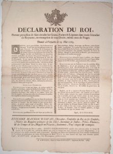 «Déclaration du Roi (Louis XV), portant permission de faire circuler les Grains, Farines & Légumes dans toute l'étendue du Royaume, en exemption de tous Droits, même ceux de Péages.» Données à Versailles le 25 Mai 1763. Suivi de l'Ordonnance d'Étienne MAYNON D'INVAU, Intendant en Picardie, Boulonnais, Pays conquis & reconquis. - Impr. à AMIENS (80), chez la Veuve GODARD, Imprimeur du roi. 1764. Placard (52 x 38) État A