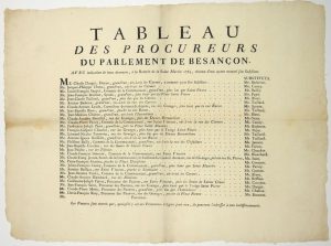 DOUBS. 1765. BOURGOGNE. «Tableau des PROCUREURS du PARLEMENT DE BESANÇON, avec indication de leurs demeures, à la rentrée de la Saint Martin 1765, chacun d'eux ayant nommé son Substitut.» - «Les Pauvres sont avertis que, quoiqu'il y ait des procureurs désignés pour eux, ils pourront s'adresser à tous indifféremment.» - Placard (36 x 48) Etat B