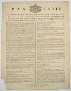 LES ANDELYS (EURE). 1765. «Pancarte des Droits de HALLAGE, MINAGE et MESURAGE des ANDELYS, Droits de Cruchon sur les denrées et Marchandises entrantes dans lesdites Villes, Droits d'Aunage des Toiles vendues auxdits lieux, Droits de Jauge & Étalonnage des Poids et Mesures de la VICOMTÉ D'ANDELYS & Droits sur les Porcs vendus aux Marchés desdites Villes appartenant à M. LEMOYNE DE BELLEISLE, aux Droits du Roi.» - Fait à Andelys le 7 Décembre 1765 - Vignette Royale - De l'Imprimerie de la Veuve d'HOURY & Fils, Imprimeur Libraire de Mgr le Duc d'ORLÉANS, rue Saint Séverin, près la rue Saint Jacques. Placard (60 x 44) État B
