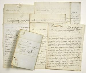 (PARIS. MARCHAND D'ESTAMPES.) Correspondance de 10 Lettres de PARIS, de 1765 à 1768 signées DE SAVARY, adressée à LENGLARD Fils, Négociant d'Estampes, rue Neuve à LILLE (59). Intéressantes lettres concernant le commerce des Estampes, Les souscriptions, les sujets du graveur et dans lesquelles il donne des nouvelles de la Capitale notamment une exécution d'un garçon boulanger qui avait assassiné son maître, condamné au Châtelet à faire amende honorable et à être rompu vif ; Et sur des grands travaux pour l'embellissement de Paris «un quai que l'on va faire depuis la place du Pont Saint Michel jusqu'au grand Châtelet....» enfin le froid n'épargne pas la Capitale «un grand nombre de bateaux ont péri sur la rivière et plusieurs personnes aussi...»