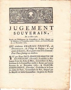 MARNE. REIMS. 1782. FAUX-SEL : «Jugement Souverain du 25 mars 1782, rendu par Nosseigneurs les Commissaires du Roi, députés par Sa Majesté en la Commission établie à REIMS, par lettres patentes du 21 Nov. 1765. Qui Condamne Charles TROUVÉ, dit DESBRELEUX, du Village de BUSIGNY (Nord), en neuf années de GALÈRES & en 400 Livres d'amende, pour Faux-Saunage en récidive.» - Donnée en la Chambre Criminelle de REIMS (51) - Impr. à REIMS, chez JEUNEHOMME, Imprimeur du Roi et de la Commission; 3pp in-4° - Bandeau.