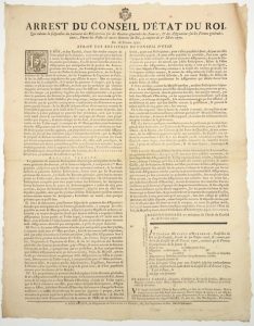 GÉNÉRALITÉ DE BORDEAUX. 1770 - «Arrest du Conseil d'État du Roi. Qui ordonne la suspension du paiement des Rescriptions sur les Recettes générales des finances, & des Assignations sur LES FERMES GÉNÉRALES-UNIES, FERME DES POSTES & autres Revenus du Roi, à compter du 1er mars 1770.» - avec modèle de la Reconnaissance - Ordonnance de François FARGÈS Intendant la Généralité de Bordeaux, ce 3 mars 1770 - petite vignette et Lettrine - Imprimé à BORDEAUX (33), chez Simon De LA COURT Fils, seul imprimeur du Roy, rue du Cahernan - Placard (54 x 41) État B