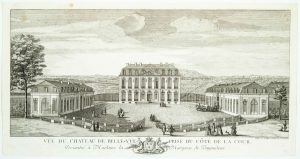 HAUTS-DE-SEINE. MEUDON (92). «Vue du Château de BELLEVUE, prise du coté de la cour, présentée à Madame la Marquise de Pompadour.» Jean-Baptiste Rigaud. ( c. 1770) Château détruit. (25,5 x 48,5 cm) Etat A-. coupée à la marque du cuivre.