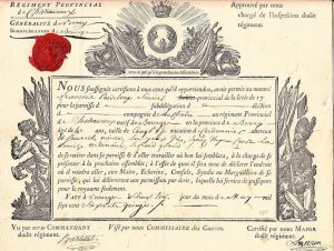 RÉGIMENT PROVINCIAL DE CHÂTEAUROUX. Généralité du BERRY - Congé jusqu'à la prochaine assemblée pour François PASDELOUP Fourrier Compagnie de CHARTRES Régiment Provincial de Châteauroux,.. natif de Bourges, vacation de Cordonnier. Fait à BOURGES, le 23 may 1775 - signatures - cachet de cire du Régiment - 1p in-folio oblong - Décoratif.