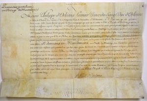 Louis Philippe , Duc d'ORLÉANS (1725-1785) Père de Philippe-Égalité et Grand-père de Louis-Philippe Pièce Signée “Louis Philippe d'ORLÉANS, Premier Prince de Sang, Duc d'ORLÉANS, de Valois, de Chartres, de Nemours & de Montpensier, Comte de Vermandois & de Soissons...” (En-tête gravé) - Brevet sur parchemin (47 x 32). Nomination à l'Office de Procureur Postulant au Bailliage de MONTAIGU en faveur du sieur Claude BIDON - Donné au PALAIS ROYAL à PARIS le 15 Mars 1776.