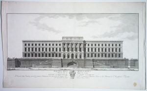 HOTEL DE LA MONNAIE (PARIS). Gravure fin XVIIIe de Claude René Gabriel POULLEAU : «HOTEL DES MONNOIES. Exécuté sur le Quay de Conty, dédié à Mr l'Abbé TERRAY, ministre d'Etat, Contrôleur général des Finances...» ANTOINE invenit. (48 x 79 cm) Etat B. Restauration d'une marge.