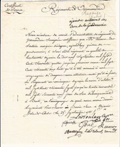 (CORSE) “Régiment de VERMANDOIS” - Certificat de Service pour Messire Étienne de LAUTURE Marquis D'ESCAYRAC, aujourd'hui GUIDON DE GENDARMERIE (Porte-Drapeau), “il a été nommé à une Compagnie de DRAGONS, nous attestons aussi qu'il a suivi le Régiment en AMÉRIQUE 1767/ 1769 jour de son débarquement à BREST...” - à AJACCIO Isle de CORSE 25 septembre 1781 - Pièce signée du Conseil du Régiment de VERMANDOIS - 1p in-4°.