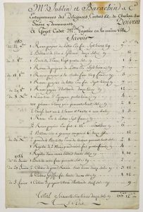 (SAÔNE-ET-LOIRE.) Mémoire pour «Mrs JUBLIN et BARACHIN et Cie Entrepreneurs des Diligences, Coches & C. de CHÂLON-SUR-SAÔNE y demeurants, des fournitures dû à GOYET Cadet Maître Papetier en la même ville, de Sept. 1783 à 2 Juillet 1784. Manuscrit signé de 2pp in-folio, fait à Chalon-sur-Saône le 11 février 1785. (Inventaires des fournitures avec leurs prix : papiers divers, poudre de buis, bâtons de cire, rames papier à lettres, bouteilles d'encres, registres, 100 plumes, etc....)