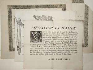 METZ (MOSELLE) 4 Placards mortuaires in-plano (1788 - 1816). Qq. défauts : «Messieurs et Dames, vous êtes invités de la part de Messieurs les Officiers du Régiment de Mestre-de-Camp-général des Dragons, d'assister au Service qui se fera Mercredi 26 Juillet 1758 dans l'Église de la Citadelle de la Ville, pour le repos de l'Âme de Très-Haut et Très-Puissant Seigneur Louis Marie FOUCQUET. Comte de GISORS, Brigadier des Armées du Roi, Gouverneur des Trois-Évêchés & des Ville et Citadelle de METZ, Lieutenant-Général de la Lorraine et du Barrois, Mestre-de-Camp-Lieutenant & Inspecteur du Corps-Royal des Carabiniers ; décédé le 27 Juin dernier des Blessures qu'il a reçu à l'armée du Bas-Rhin. (36 x 45). Affiche coupée en deux, restaurée, quelques pertes de lettres. + Enterrement du 21 Octobre 1788, de Dame Anne TINOT, épouse de Charles Nicolas CAMUS, Conseiller-Échevin de l'Hôtel de Ville & Lieutenant de Police de METZ, ancien Conseiller du Roi, Premier Juge-garde de la Monnaie de METZ, dans l'Église Saint Martin sa Paroisse. (38 x 45). Impr. à METZ, chez J.B. Collignon. + Enterrement de Madame la Comtesse Charlotte-Eugénie de CHOISEUL-STAINVILLE, Abbesse de l'ancien Chapitre Royal, noble et séculier de Saint-Louis qui aura lieu le 7 Février 1816, dans l'Église Cathédrale.» Impr. à METZ, de l'Imprimerie de C. LAMORT. (44 x 54). Un angle déchiré. + Enterrement de M. Claude GURY, âgé de 59 ans, Marchand Vitrier à METZ, Place du Quarteau, dans l'Église Saint Martin sa paroisse. (43 x 53).
