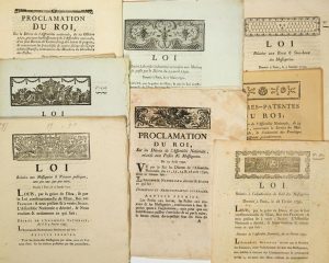 POSTES & MESSAGERIES. 9 Imprimés : Lettres Patentes du Roi.., du 25 avril 1790, concernant le Service des Maîtres de Poste, & l'indemnité des Privilèges dont ils jouissaient précédemment. 5 mai 1790. Impr. à PERPIGNAN, 3pp in-4° (réparation du pli) + LOI relative à diverses indemnités accordées aux Maîtres de poste par le Décret du 25 Avril 1790 - Données le 27 mars 1791 - Bandeau - Impr. à BEAUVAIS, 3pp in-4° + LOI relative à la résiliation du Privilège exclusif des Carrosses de Place & des Voitures des environs de Paris. 24 nov. 1790 - Bandeau - Impr. à Paris, de l'Imprimerie royale, 3pp in-4°.+ Proclamation du Roi, sur les Décrets de l'Assemblée Nle, relatif aux Postes & Messageries. 29 août 1790 - (Défauts, qq. manques) - Impr. à CAEN, 11pp in-4° + Proclamation du Roi,.. portant établissement près l'Assemblée Nationale, d'un seul Bureau de Contre-Seing des lettres et paquets... nomination des membres du Directoire des Postes. - 19 oct. 1790 - Impr. à GRENOBLE, 4pp in-4° + LOI relative aux Pensions à la charge de la Ferme des Messageries, 20 juillet 1791 - N°1126 - Bandeau - Impr. au MANS, 7pp in-4° + LOI relative à l'adjudication du Bail des Messageries. 18 Fév. 1791 - N°580 - Bandeau - Impr. à CASTRES, 3pp in-4° + LOI relative aux Messageries & Voitures publiques, tant par eau que par terre. 19 Janv. 1791 - Bandeau - TARIF - Impr. à AUXERRE, 7pp in-4° + LOI relative aux Baux & Sous-Baux des Messageries. 5 Janv. 1791 - N°288 - Impr. à ALBI, 3pp in-4°.