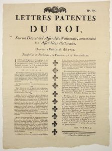 ASSEMBLÉE NATIONALE. 1790. «Lettres patentes du Roi (Louis XVI), sur un décret de l'Assemblée Nationale, concernant les Assemblées Électorales.» Données à Paris le 28 Mai 1790. «Les Bureaux de vote procéderons au même moment aux élections. Tout Bulletin qui n'aura pas écrit par le Votant lui-même sera rejeté comme nul.» - Impr. à PARIS, chez N.H. NYON, Imprimeur du parlement rue Mignon Saint-André-des-Arcs, 1790. Placard (50 x 37) Etat A.