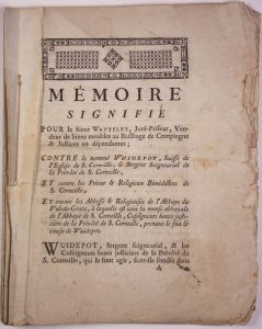 OISE. 1785. ABBAYE SAINT-CORNEILLE située à COMPIÈGNE (60) fondée en 876, et déclaré Bien National en 1791 : Procès : «Mémoire signifié pour le Sieur WATTELET, Juré-Priseur, Vendeur de biens meubles au Bailliage de COMPIÈGNE & Justices en dépendances : contre le nommé WUIDEPOT, Suisse de l'Eglise de S. CORNEILLE, & Sergent Seigneurial de la Prévôté de S. CORNEILLE, et contre le Prieur & Religieux Bénédictins de S. CORNEILLE, Et entre les Abbesse & religieuses de l'Abbaye du VAL-DE-GRACE, à laquelle est unie la Mense abbatiale de l'Abbaye de S. CORNEILLE, prenant le fait & cause de WUIDEPOT.» De l'Imprimerie de Demonville, rue Christine, 1785 ; 42pp in-4°.